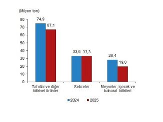 Bitkisel üretimin bir önceki yıla göre azalacağı tahmin edildi Üretim miktarlarının, 2025 yılı ikinci tahmininde bir önceki yıla göre tarla ürünleri olan tahıllar ve diğer bitkisel ürünlerde (yem bitkileri hariç) %10,4, sebzelerde %0,8, meyveler, içecek ve baharat bitkilerinde %30,4 oranında azalacağı tahmin edildi.