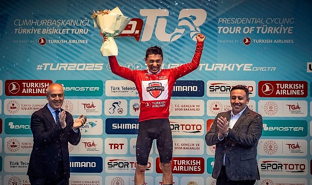 Spor Toto sponsorluğunda genel klasman liderinin giydiği turkuaz mayoyu Wout Poels’a, Türkiye Bisiklet Federasyonu Başkanı Emin Müftüoğlu ve Muğla Valisi Dr. İdris Akbıyık verdi.