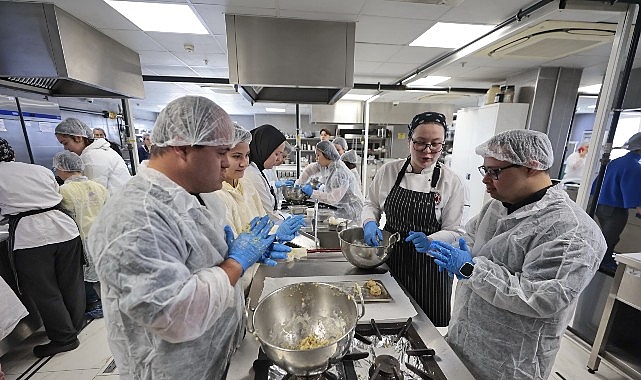 Konak Belediyesi’nin İzmir Konak Meslek Yüksekokulu iş birliğinde gerçekleştirdiği “Engelsiz Mutfak: Down Sendromlu Bireylere Lezzet Atölyesi”ne katılan down sendromlu bireyler yaptıkları kek ve kurabiyelerle aşçılara taş çıkarttı.
