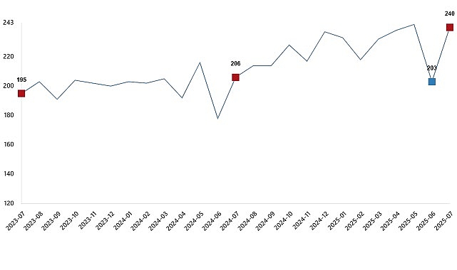 Bir önceki ay 202 bin 521 ton olan tavuk eti üretimi Temmuz ayında %18,4 oranında artarak 239 bin 876 ton oldu.